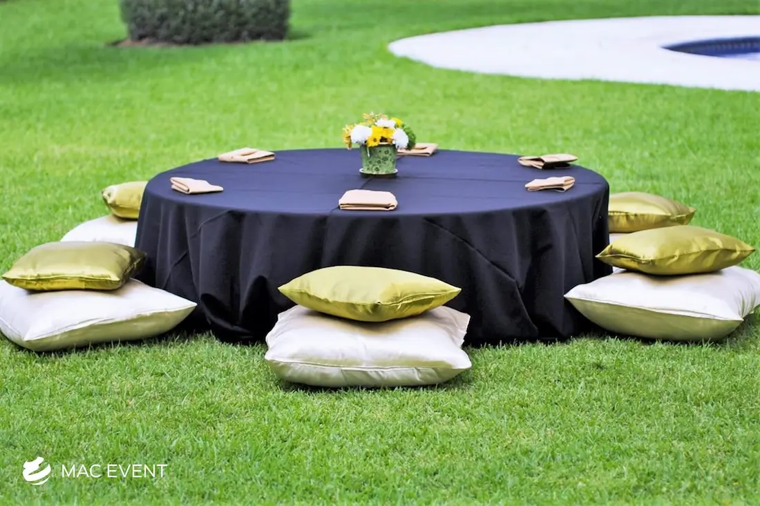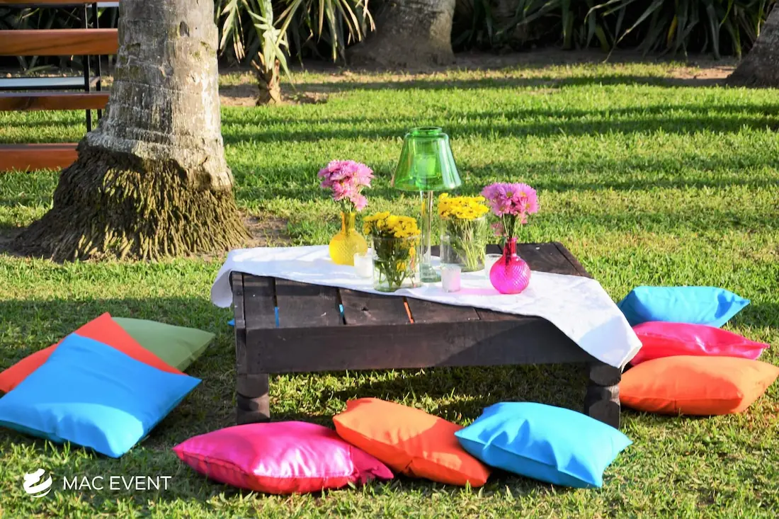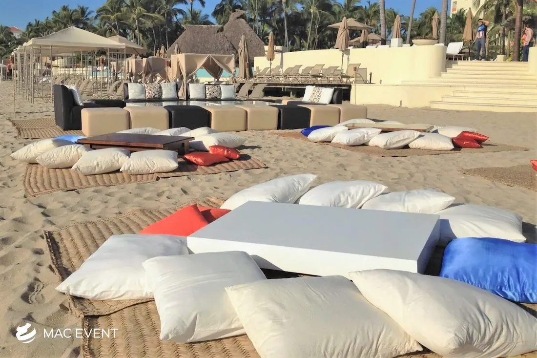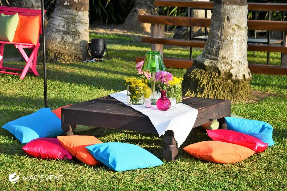 The picnic lounge brings a casual and charming vibe to weddings, beach gatherings, and corporate events in La Cruz de Huanacaxtle. Designed for comfort and connection, this event lounge rental features low tables, floor pillows, and relaxed seating that create a cozy, outdoor-friendly atmosphere. Perfect for boho themes, tropical celebrations, or family-style setups, the picnic lounge encourages guests to sit back and enjoy the moment. Renting picnic lounges in La Cruz de Huanacaxtle adds warmth, style, and a touch of creativity to your event décor. For a laid-back yet elegant experience, the picnic lounge is an ideal addition to any celebration.